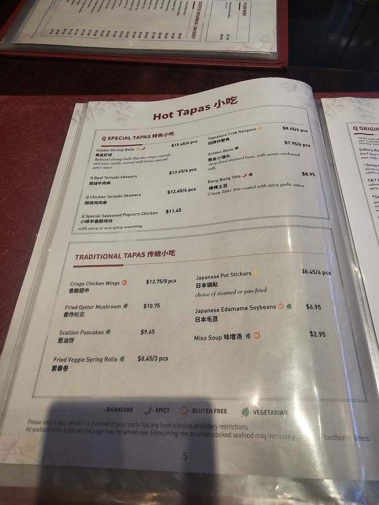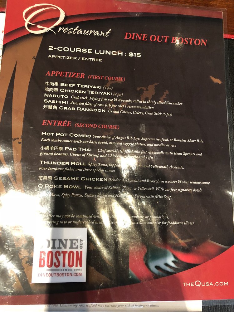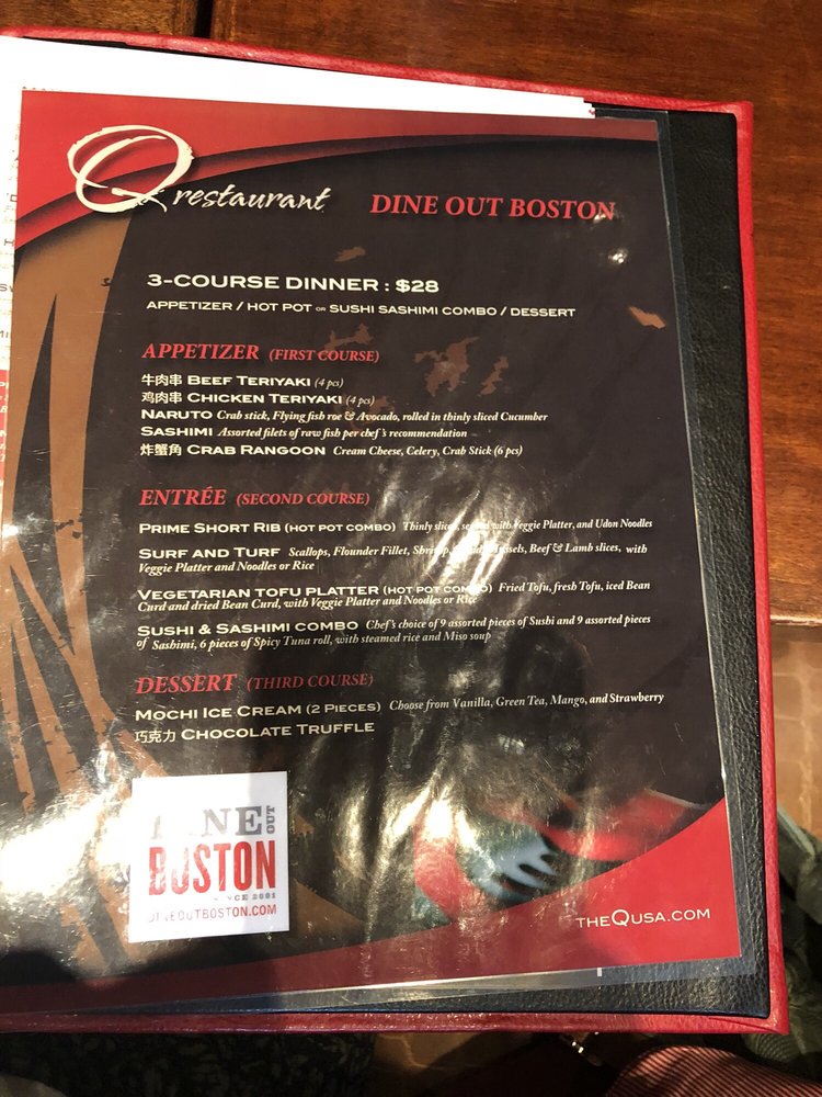 Q Restaurant is a Chinese, sushi bar, and hot pot fusion eatery located at 660 Washington St Boston, MA. With a wide range of options for vegans, vegetarians, and meat lovers, this restaurant offers a trendy and casual dining experience. From beef stew in chili broth to flounder with snow peas, the chef's specials showcase the bold flavors of traditional Chinese cuisine. Customers praise the fresh and delicious sushi, as well as the interactive hot pot experience. The menu is easy to navigate, accommodating various dietary preferences, making it a great spot for groups or special occasions. With attentive service and a vibrant ambiance, Q Restaurant is highly recommended for those looking for a unique dining experience in Boston.